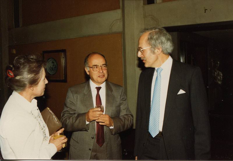 Atiyah's 60th birthday celebration. Left to right: Rosemary Zeeman, Michael Atiyah, Raymond Lickorish.