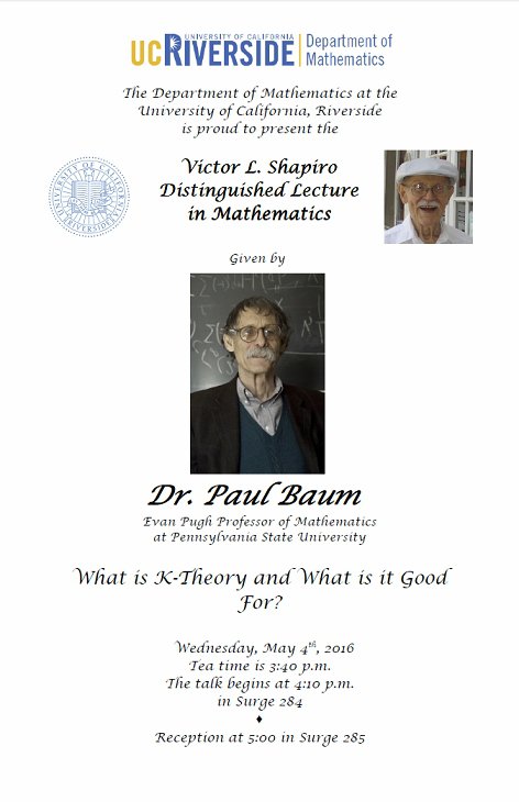 Announcement for a University of California, Riverside, lecture by Paul Baum.