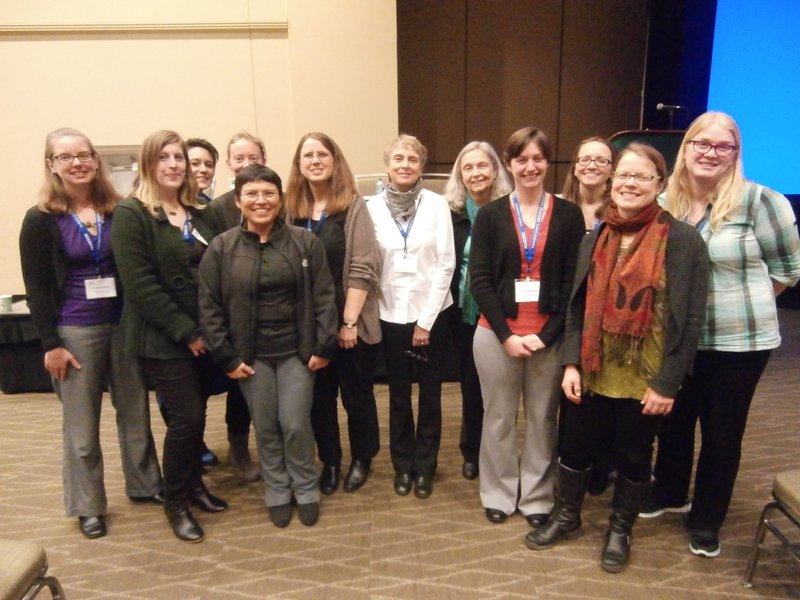 AWM Workshop at JMM 2016 (Seattle, WA): Special Session on Algebraic Combinatorics, II: "Discrete Homotopy and Homology Groups", led by Hèléne Barcelo (white shirt, at center). Georgia Benkart is to her left.