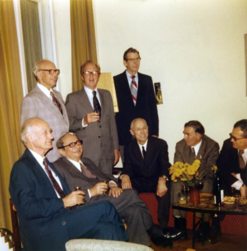 Seated (left to right): F. Burton Jones, Kazimierz Kuratowski, Karol Borsuk, ?, Mikhail Postnikov (?). Photo taken in Warsaw, 1978.