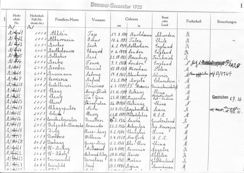 Grade book from Chern's graduate student years at the University of Hamburg in Germany (1935). He is thirteenth on the list.