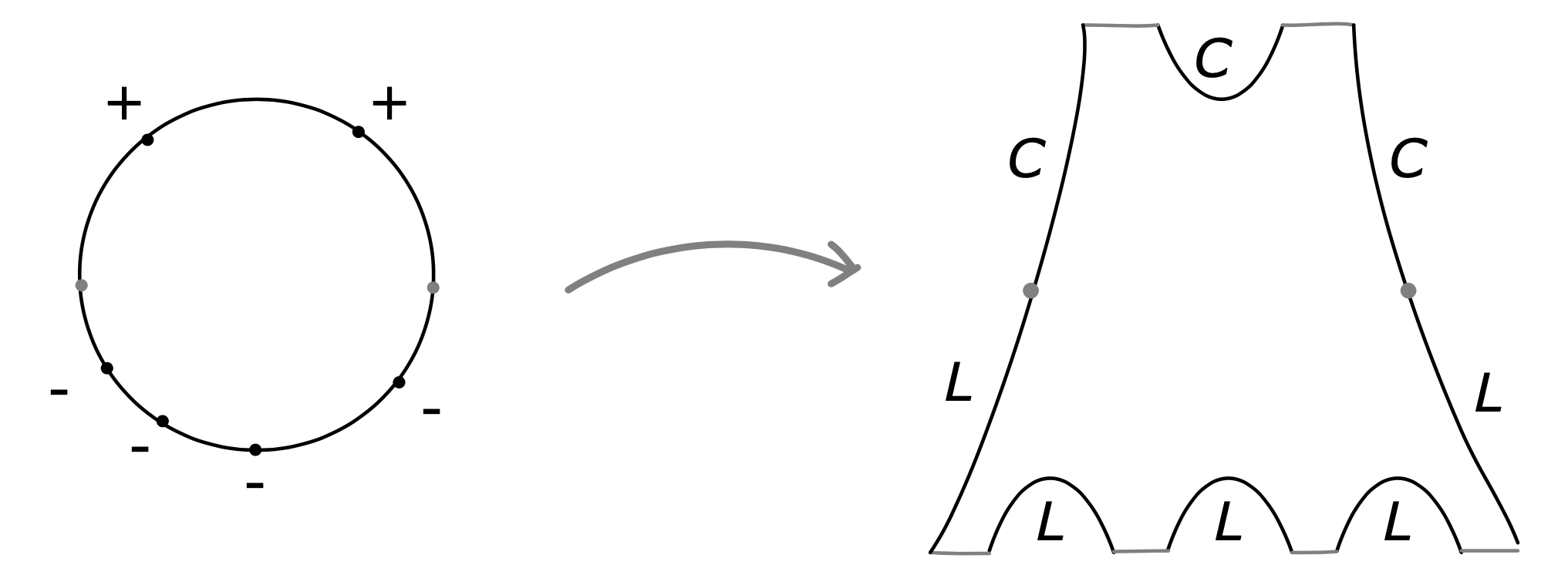 Proof. The proof uses induction on action. For one-letter words an explicit construction gives one transversely cut-out strip which is unique by an action argument. Assume inductively that the count of curves in moduli space of disks connecting \( \overline{w} \) to \( w \) for all words of length \( \le m \) equals \( \pm 1 \). Then consider the moduli space of disks with two positive punctures at \( \overline{w}_{0} \) and \( \overline{w}_{1} \) and negative punctures at \( w_{0}w_{1} \). By action this moduli space has only two boundary breakings (see Figure 5): breaking at a point in \( C\cap L \), by induction we know that the count of such configurations equal \( \pm 1 \), and breaking into a disk with two positive and one negative puncture followed by an isomorphism disk, we conclude that both of these moduli spaces must also contain \( \pm 1 \) elements; see ([e4], Section 7). □