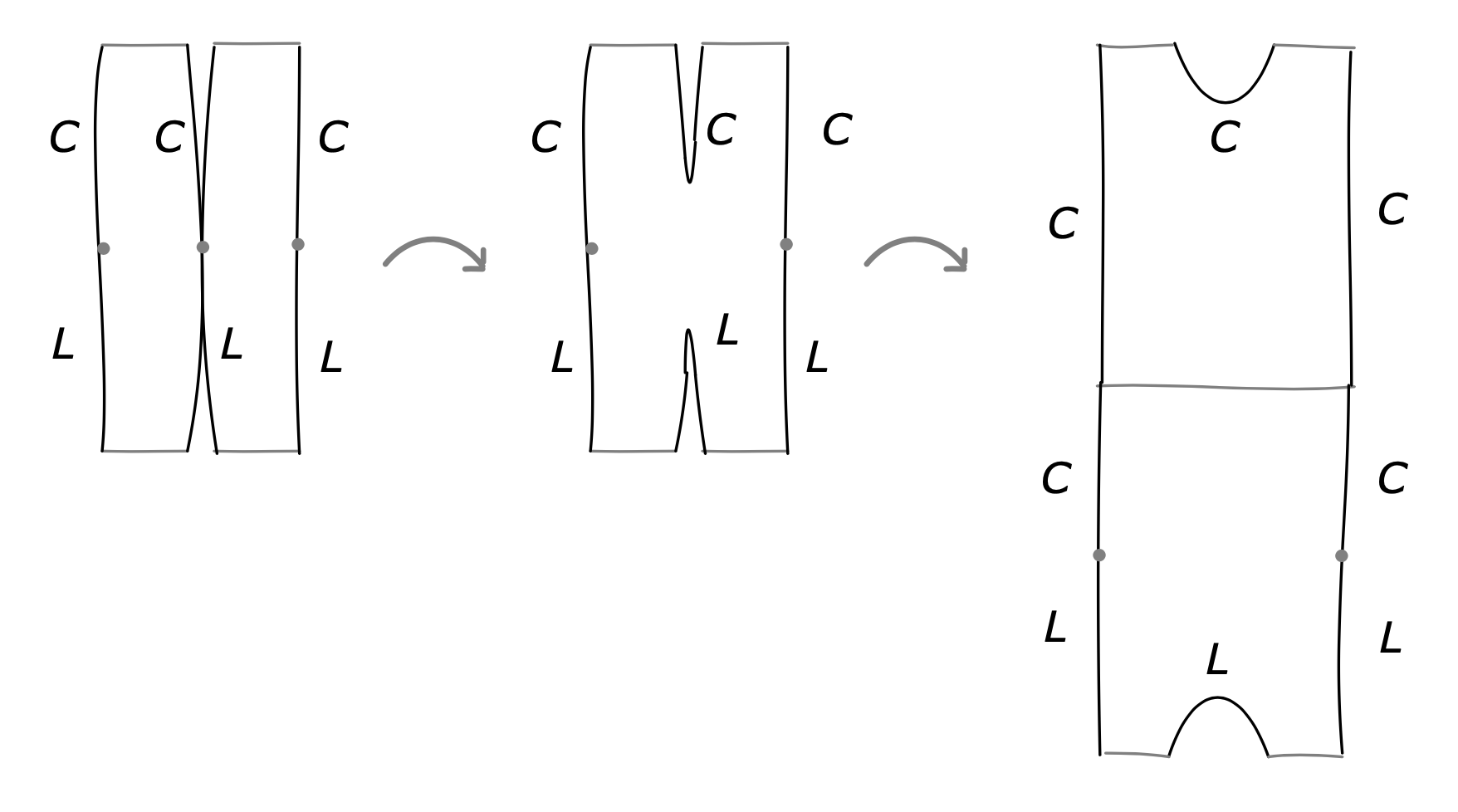 We next glue \( D_{\mathrm{up}} \) and \( D_{\mathrm{dn}} \) via a cobordism corresponding to an isotopy that interchanges \( \partial C_0 \) and \( \partial C_1 \). The Lagrangian cobordism \( T\subset \mathbb{R}\times\partial X \) corresponds to the Legendrian isotopy in \( \partial X \) that rotates \( \partial C_0 \) to \( \partial C_1 \), and then takes the shifting function to its negative. It is easy to see that if \( C_0 \) and \( C_1 \) are sufficiently close and the rotation is sufficiently slow, all rigid holomorphic curves in the cobordism corresponds to (reparameterized) trivial Reeb chord strips of \( c \) and strips (corresponding to Morse flow lines) that interchanges the small Reeb chords that follows the rotation. Let \( \mathcal{M}(T) \) denote the moduli space of rigid holomorphic curves with boundary on \( T \).