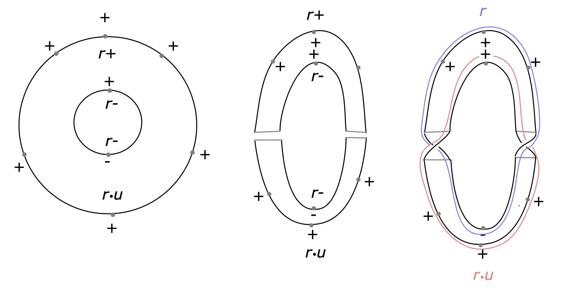 Noting that the curves in \( \mathcal{M}(T) \) are strips that exactly give the natural 1-1 correspondence between Reeb chords \( C_0\to C_1 \) and \( C_1\to C_0 \), we find that the result of gluing \( D_{\mathrm{dn}} \) via \( \mathcal{M}(T) \) to \( D_{\mathrm{up}} \) are new annuli of dimension 2 that have positive punctures according to \( r\cdot u \) along one boundary component and positive and one negative puncture according to \( r \). Then, deforming the Lagrangians to the standard \( C_0\cup C_1 \) and following the domains until it splits at a Reeb orbit, we find that \[ \mathcal{CO}(\mathcal{OC}(r\cdot u))=r, \] up to exact terms; see Figure 8. It follows in particular that \( \mathcal{CO} \) is surjective. The theorem follows. □