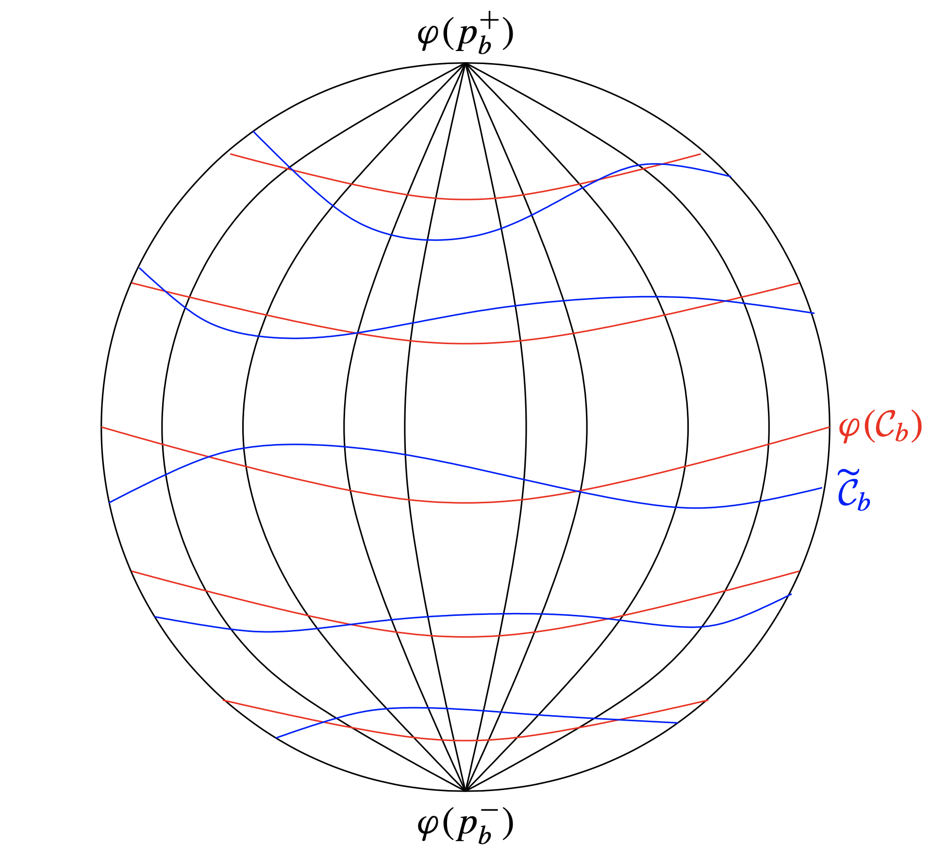 Now, let \( \varphi \) be a contactomorphism of \( (S^3,\xi_{\mathrm{st}}) \) as above. Then the punctured sphere \( \varphi(S^2_b\setminus\{p_b^{\pm}\}) \) comes with two foliations transverse to its characteristic foliation \( \varphi(\mathcal{F}_b) \). The first one is simply the image foliation \( \varphi(\mathcal{C}_b) \). The second foliation \( \widetilde{\mathcal{C}}_b \) is given by the boundaries of holomorphic discs filling \( \varphi(S^2_b) \), thanks to Eliashberg’s filling theorem. See Figure 1, where \( \varphi(\mathcal{F}_b) \) is the longitudinal foliation.