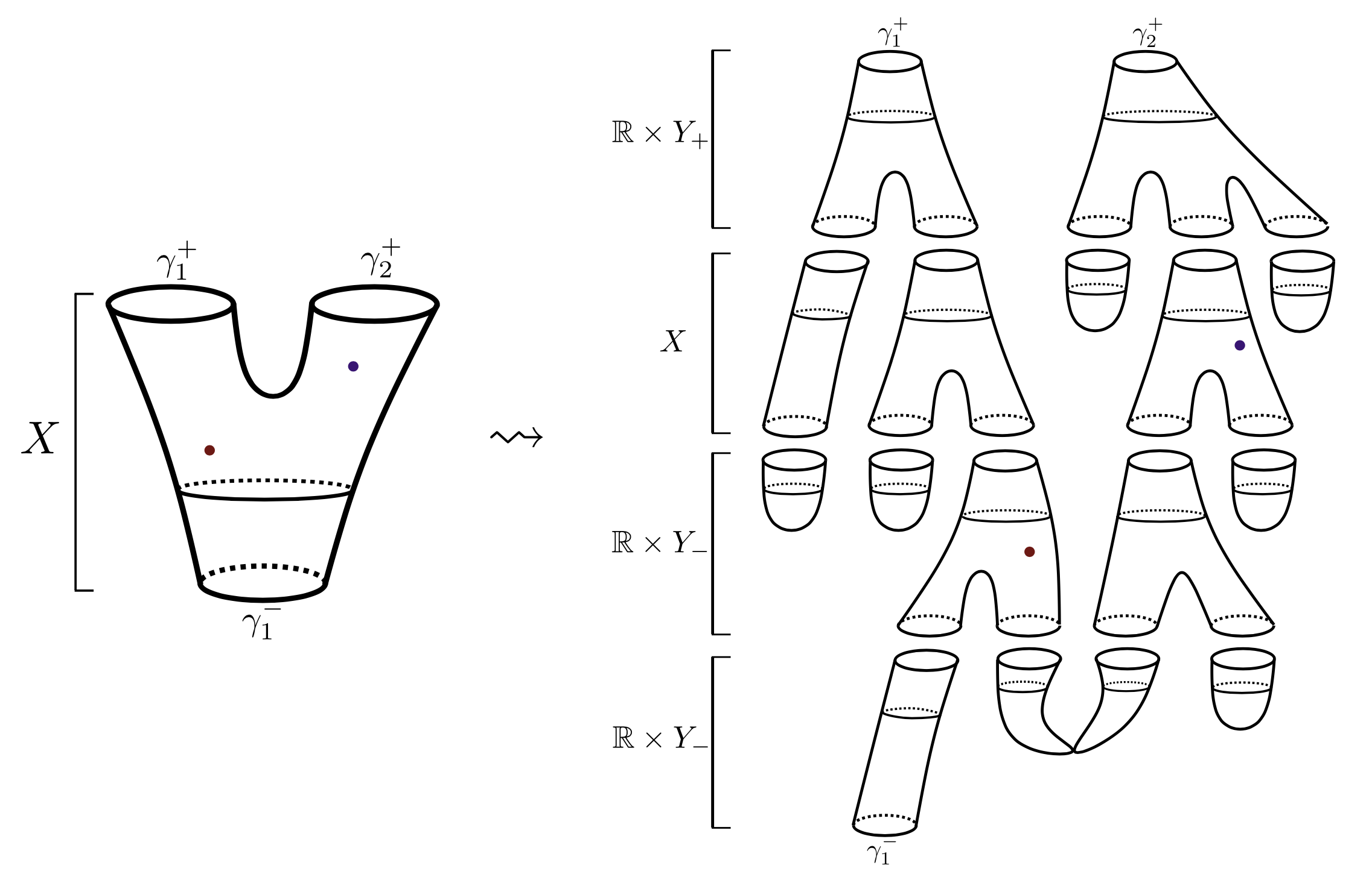 For \( i = 1,\dots,k \), let \[\operatorname{ev}_i: \overline{\mathcal{M}}_{g,k,A}^{\widehat{X},J}(\Gamma_+;\Gamma_-) \rightarrow \widehat{X}\] denote the evaluation map at the \( i \)-th marked point. By analogy with Gromov–Witten theory, it is tempting to pick cohomology classes \( B_1,\dots,B_k \in H^*(\widehat{X}) \) and then integrate the cohomology class \[ \operatorname{ev}_1^*(B_1) \cup \dots \cup \operatorname{ev}_k^*(B_k) \] over \( \overline{\mathcal{M}}_{g,k,A}^{\widehat{X},J}(\Gamma_+;\Gamma_-) \) to obtain a numerical invariant whenever the degree matches the dimension of the moduli space. However, an important complication is that, in contrast with Gromov–Witten theory, these compactified moduli spaces typically have boundary strata of expected codimension one, and hence the integral is not well defined (even virtually) without more care.