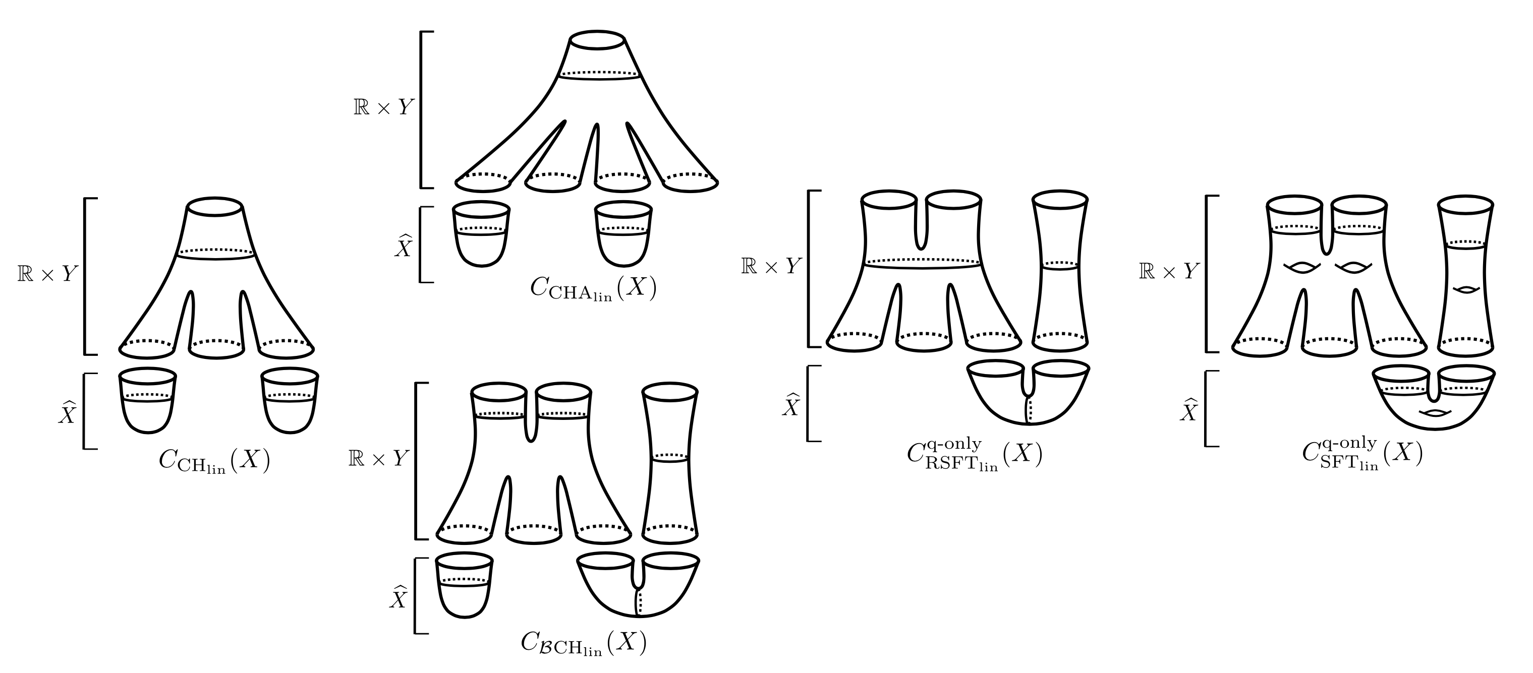 Similarly, for symplectization curves we have evaluation maps \[\operatorname{ev}_i: \overline{\mathcal{M}}_{g,k,A}^{\mathbb{R} \times Y,J}(\Gamma_+;\Gamma_-)/\mathbb{R} \rightarrow Y,\] and for cycles \( \mho_1,\dots,\mho_k \) in \( Y \) we define a deformed differential \[ \partial_{\operatorname{CHA}} < \mkern-17mu\raise{.5pt}{ < } \mho_1^\bullet,\dots,\mho_k^\bullet \raise{.5pt}{ > }\mkern-17mu > : \mathcal{A}_{Y_+}[\![ t_1,\dots,t_k]\!] \rightarrow \mathcal{A}_{Y_-}[\![ t_1,\dots,t_k]\!] \] which roughly counts index one rational curves in \( \mathbb{R} \times Y \) with one positive end and many negative ends, with extra marked points mapping to various copies of \( \mho_1,\dots,\mho_k \), modulo target translations. The homology of the resulting DGA depends only on the homology classes of \( \mho_1,\dots,\mho_k \).