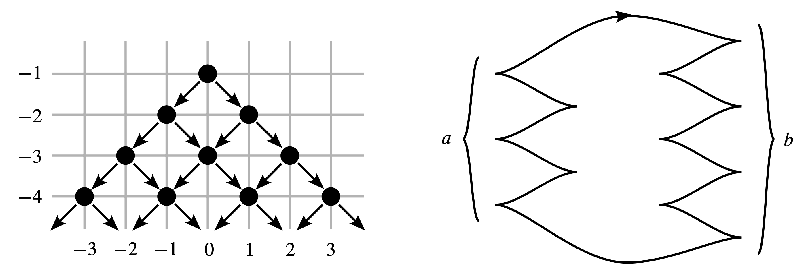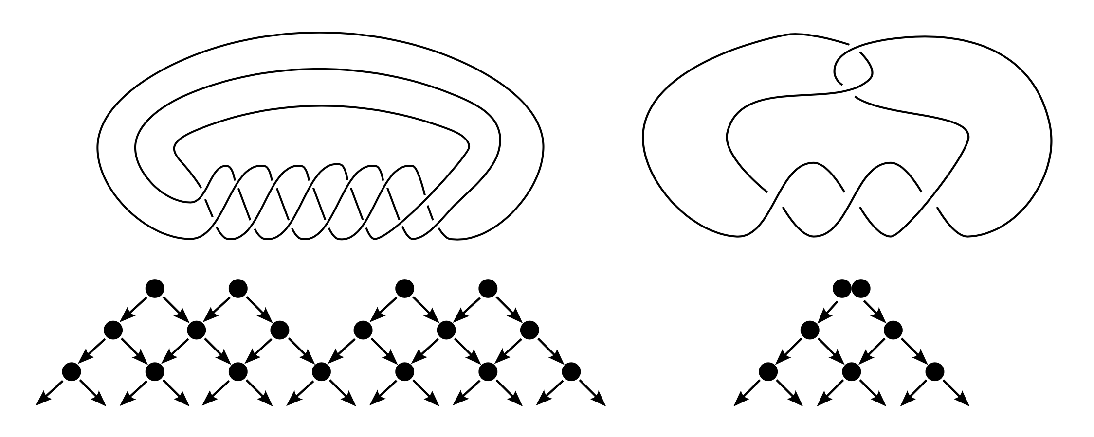 The arrows in the plot of \( (\operatorname{rot},\operatorname{tb}) \) in Figure 1 represent the geometric operations \( S_\pm \) called positive and negative stabilization, which start with a Legendrian knot and produce another one by inserting a zigzag along the front. The Thurston–Bennequin and rotation numbers change under stabilization as follows: \[ (\operatorname{rot}(S_\pm(\Lambda)),\operatorname{tb}(S_\pm(\Lambda)) = (\operatorname{rot}(\Lambda)\pm 1,\operatorname{tb}(\Lambda)-1). \] Each of the Legendrian unknots shown in Figure 1 is the result of applying a sequence of stabilizations to the “flying-saucer” unknot with \( (a,b)=(1,1) \) and \( (\operatorname{rot},\operatorname{tb}) = (0,-1) \); in the \( (\operatorname{rot},\operatorname{tb}) \)-plane, this unknot forms the peak of the mountain of Legendrian unknots.