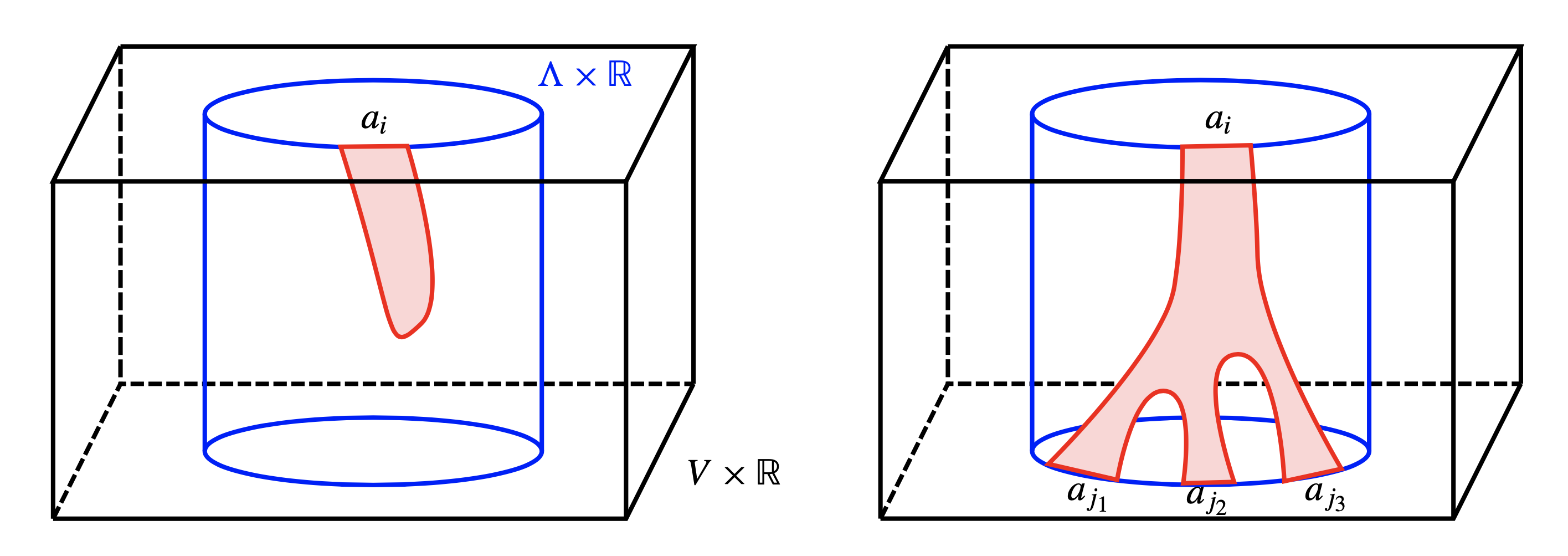 The algebra \( \mathcal{A} \) associated to the Legendrian \( \Lambda \) is a (noncommutative, unital) tensor algebra freely generated by the Reeb chords of \( \Lambda \). The differential \( \partial \) of a generator \( a_i \) is a sum of terms of the form \( a_{j_1}\cdots a_{j_k} \) over moduli spaces \[ \mathcal{M}(a_i;a_{j_1},\dots,a_{j_k}) \] of rigid holomorphic disks in \( V\times\mathbb{R} \) with boundary on the Lagrangian cylinder \( \Lambda\times\mathbb{R} \), a single “positive end” asymptotic to the Reeb chord \( a_i \) at \( +\infty \) in the \( \mathbb{R} \) direction, and any number of “negative ends” asymptotic to Reeb chords \( a_{j_1},\dots,a_{j_k} \) at \( -\infty \). (If we replace “holomorphic disks” by “holomorphic spheres” without boundary, and “Reeb chords” by “Reeb orbits”, then a similar sum enters into the definition of usual contact homology.) See Figure 3 for an illustration.