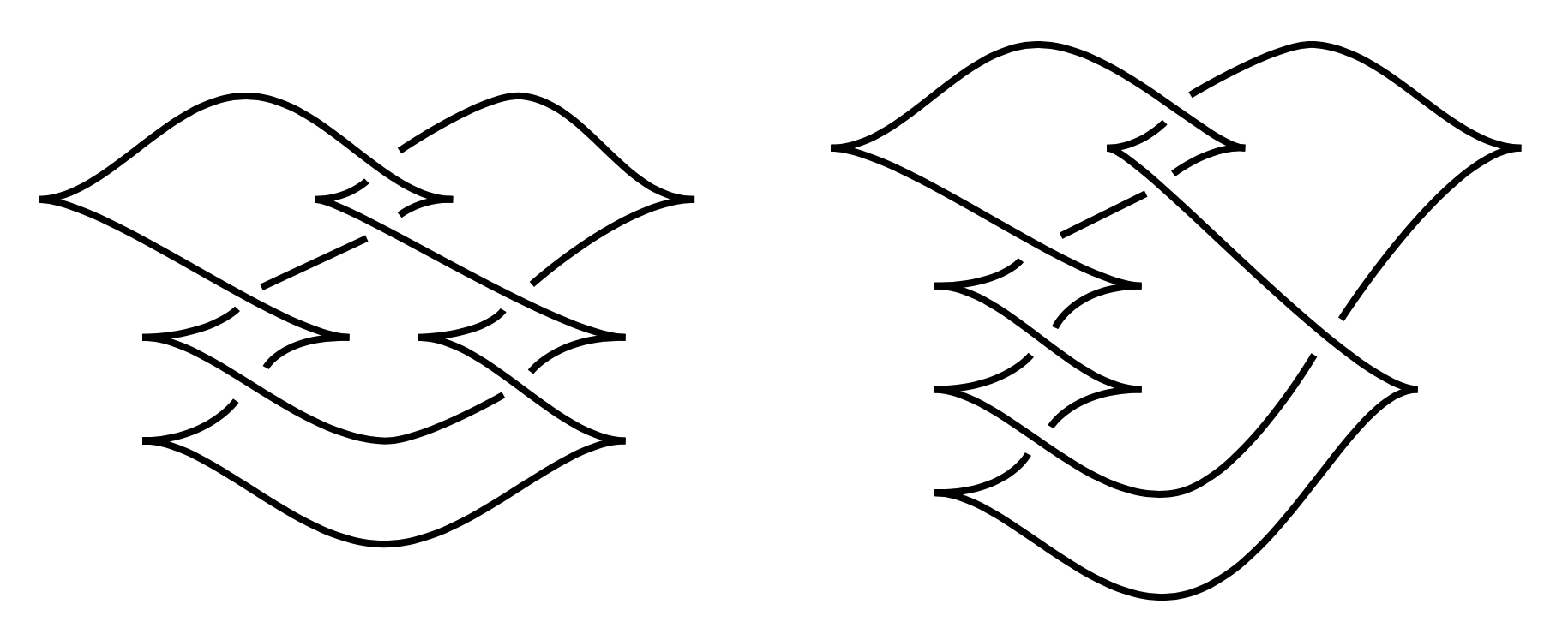 Legendrian contact homology proved to be a powerful invariant of Legendrian submanifolds. For Legendrian knots in \( \mathbb{R}^3 \), LCH is a “nonclassical” invariant: that is, it can distinguish between Legendrian knots that share their classical invariants (smooth knot type, Thurston–Bennequin number, and rotation number). Building off of his classification of Legendrian unknots discussed in Section 2, Eliashberg (unpublished) proposed a family of Legendrian knots with the same classical invariants that could be distinguished through their LCH: Whitehead doubles of Legendrian unknots, where the unknots have the same Thurston–Bennequin number but different rotation numbers. Topologically, these Whitehead doubles are called twist knots. In [e9], Chekanov provided the first rigorous proof that there is a pair of Legendrian knots with the same classical invariants but different LCH. This pair is of topological knot type \( m(5_2) \) and is shown in Figure 4; like Eliashberg’s family, the Chekanov pair are twist knots. Shortly thereafter, Epstein, Fuchs, and Meyer [e6] used Chekanov’s techniques to show that Eliashberg’s entire family of twist knots can be distinguished through their LCH invariants.
