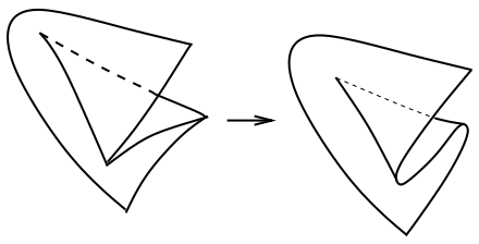 The difficulty is in some sense standard; indeed it is not always possible to cancel pairs of critical points of functions (for example for a function \( S^1 \to \mathbf{R} \)), though creating cancelling pairs of critical points is always possible. Remarkably, it turns out that this rigidity only appears at the level of folds: all other inverse surgeries of corank 1 singularities can be geometrically realized. Eliashberg proved this by factoring (most) inverse surgeries as a composition of direct surgeries.