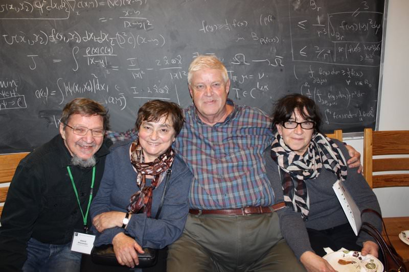 Askold and Tanya Khovanskii (at left) with Dmitry and Ira Kloumova (Fuchs) at the conference "The legacy of Vladimir Arnold", Fields Institute, Toronto, 2014.