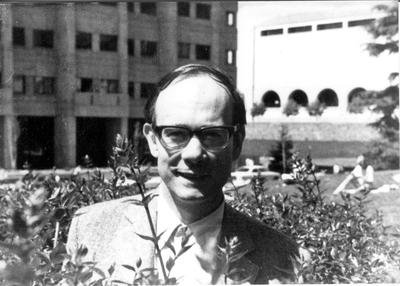 A portrait of Friedrich Hirzebruch taken by George Bergman on the UC Berkeley campus. Evans Hall, which housed the Mathematics Department at that time, is visible beyond Hirzebruch's right shoulder.