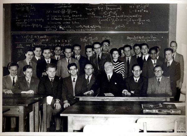 Frong row (left to right): Hans Joachim Bremermann, Hans Grauert, Reinhold Remmert, George Springer, Friedrich Sommer, Heinrich Behnke, Friedrich Ernst Peter Hirzebruch, and Max Koecher. Karl-Bernhard Gundlach also appears, third row at right (Münster, 1955).