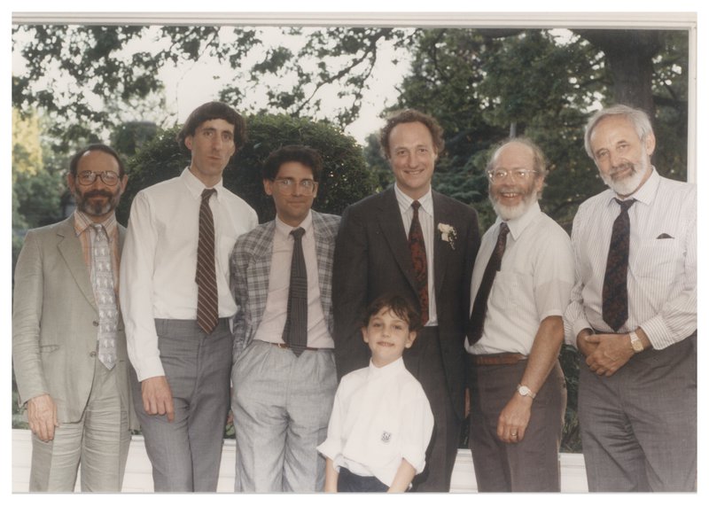 Rob attends John Morgan's wedding in 1994. Left to right: Hy Bass, Cliff Taubes, Bob Friedman, John, Rob, Raoul Bott, and (in front) John's young son, Jake.