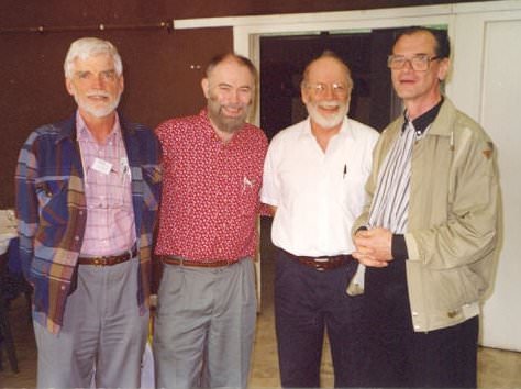 The "homeomorphisms group" at the Poenaru–Siebenmann birthday fest at Orsay in June 1999 (left to right): Bob Edwards, Larry Siebenmann, Rob Kirby, and A. V. Cernavskii. Kirby found his torus trick in August 1968 while examing Cernavskii's manuscript showing that the space of homeomorphisms of a topological manifold is locally contractible.