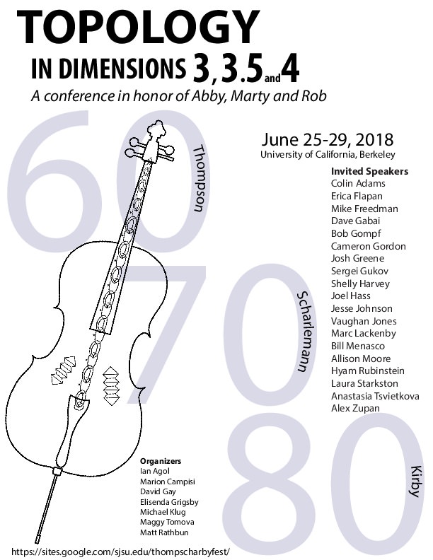 The poster for the 60-70-80 conference honoring Abby Thompson, Marty Scharlemann and Rob Kirby: "Topology in Dimensions 3, 3.5 and 4", June 25–29, 2018, University of Caifornia, Berkeley.