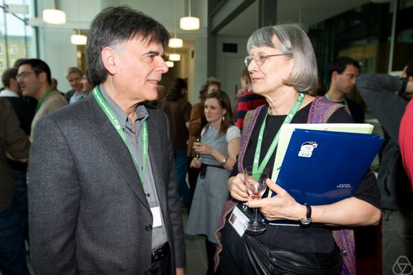 Graeme Segal (left) and Dusa McDuff (right) on the occasion of Atiyah's 80th birthday celebration, April 20--22, 2009, Edinburgh. Photographer: Thomas Köppe.