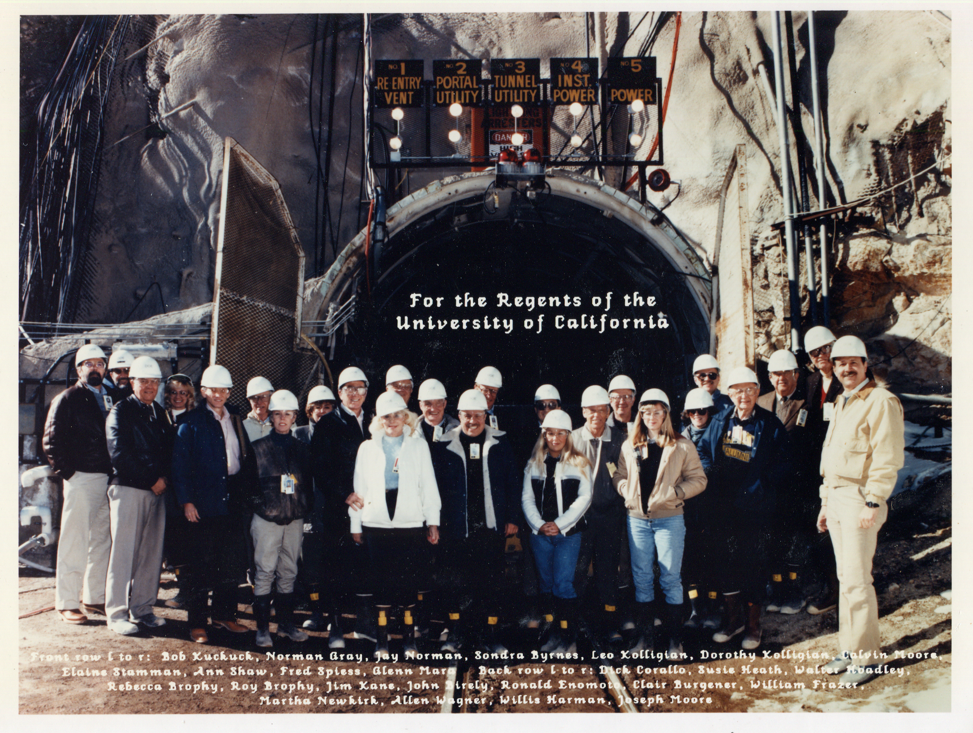 A group photo memorializing a visit to the Nevada Test Site in 1990. Cal Moore is at the center in the front row (blue jacket with white collar.