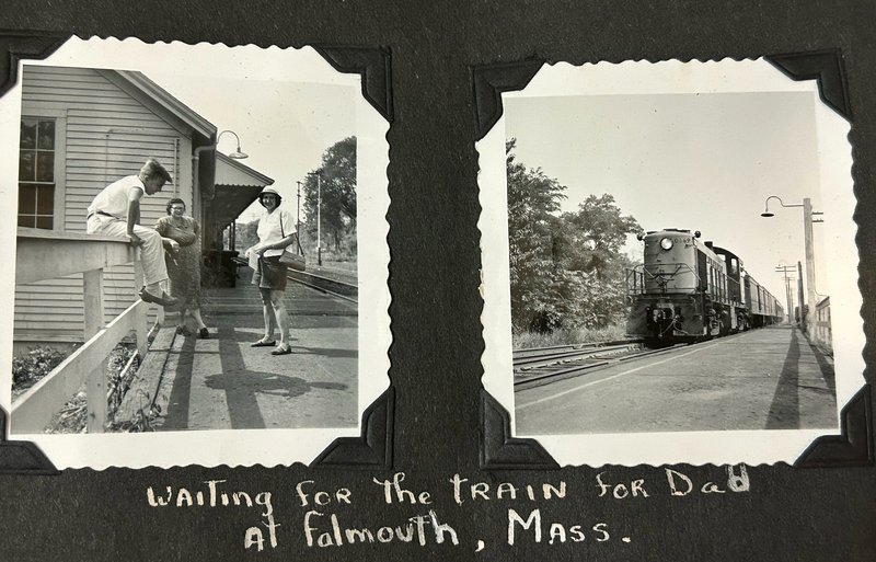 "Waiting for the train for Dad" (Falmouth, MA), with Cal on the fence.