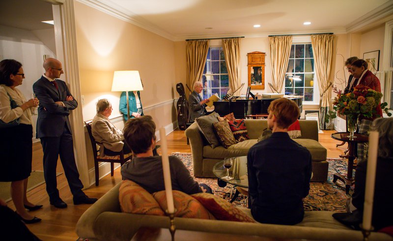 Ogg at the piano at Olden Farm, the Director's Residence of the IAS, during the Celebration In Honor of the Frank C. and Florence S. Ogg Professorship at the Institute for Advanced Study in Princeton, New Jersey (October, 2022). Standing in the doorway are Camillo de Lellis and his wife Lorenza. Phil Griffiths observes from a chair by the lamp; Jacob Lurie, John Duncan and Winnie Li are seated on the sofa (left to right, respectively). Michael and Roseanne Magada are standing to the right of the piano.