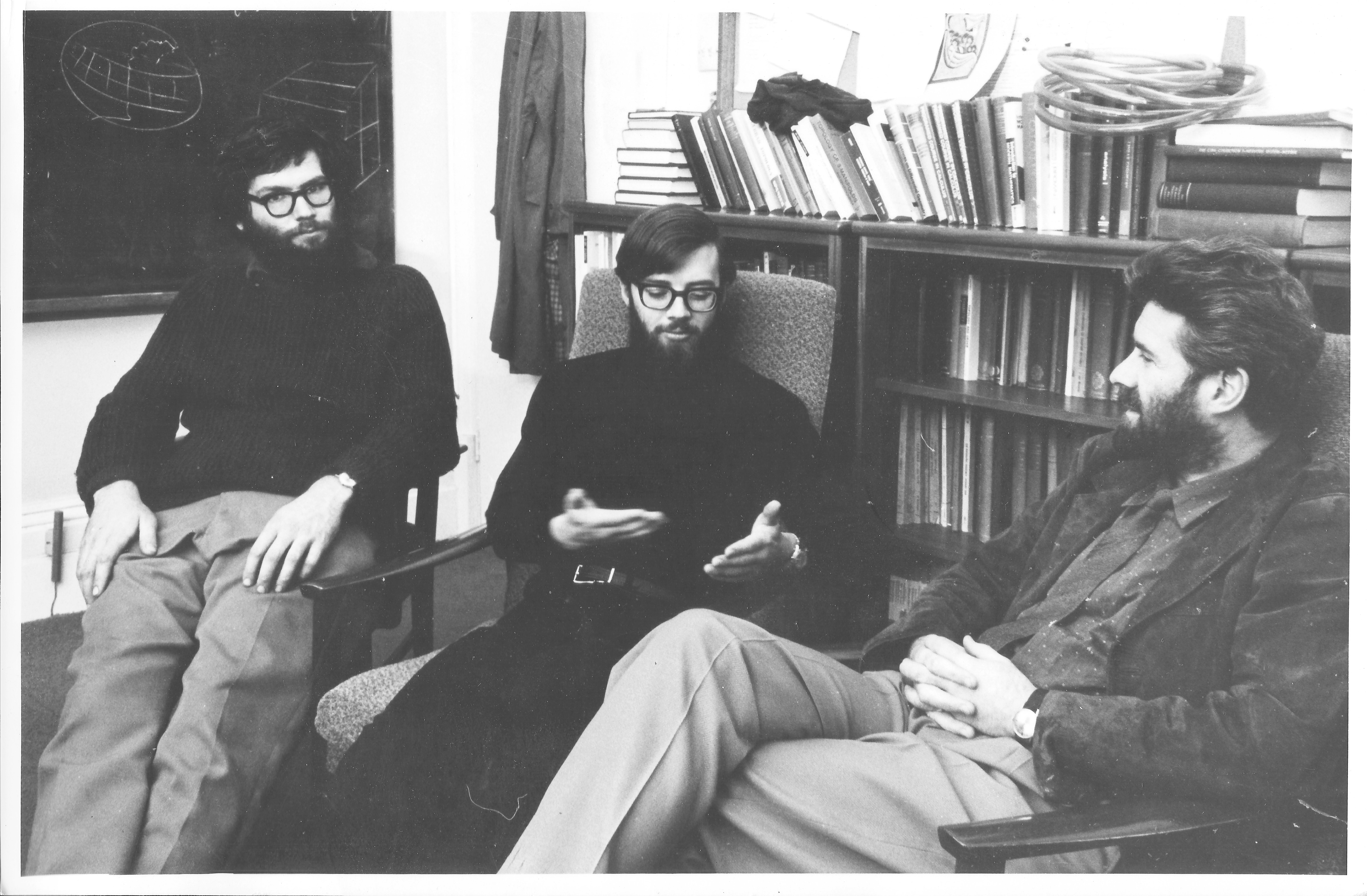 Colin Rourke (left), Brian Sanderson (center) and Christopher Zeeman (right) discussing transversality using block bundles, 1966.
