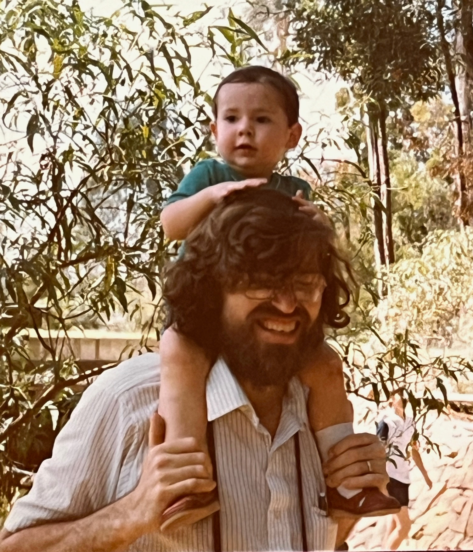 Bill Thurston with Ben Rubinstein on his shoulders (Melbourne, Australia, January 1981.)