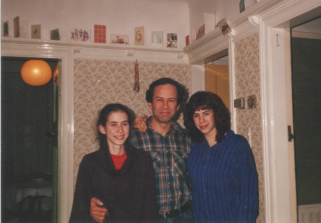 Peter Scott with daughters Kathy (left) and Carol (right) in the family home in Liverpool (1987).