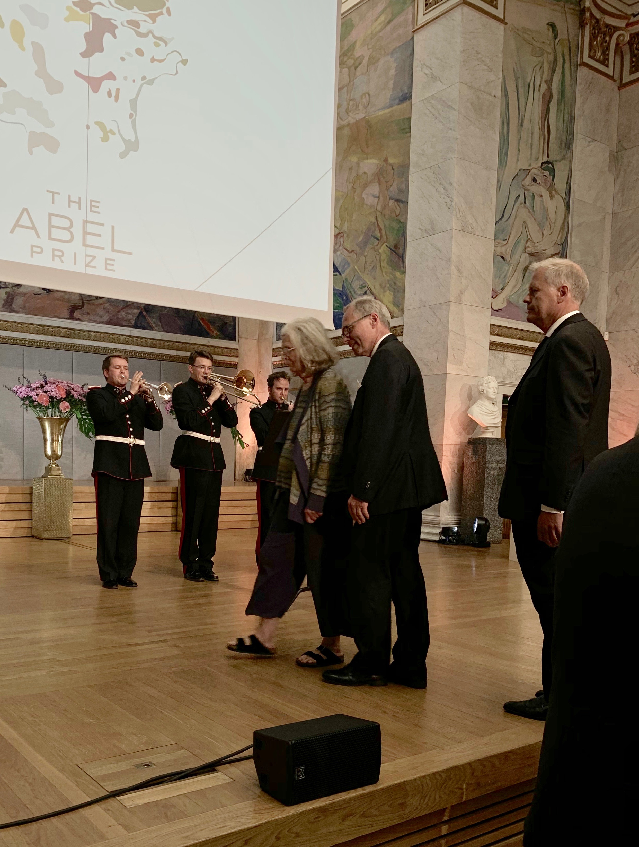 Karen Uhlenbeck walks onto the stage during the 2019 Abel Prize presentation ceremony in Oslo.